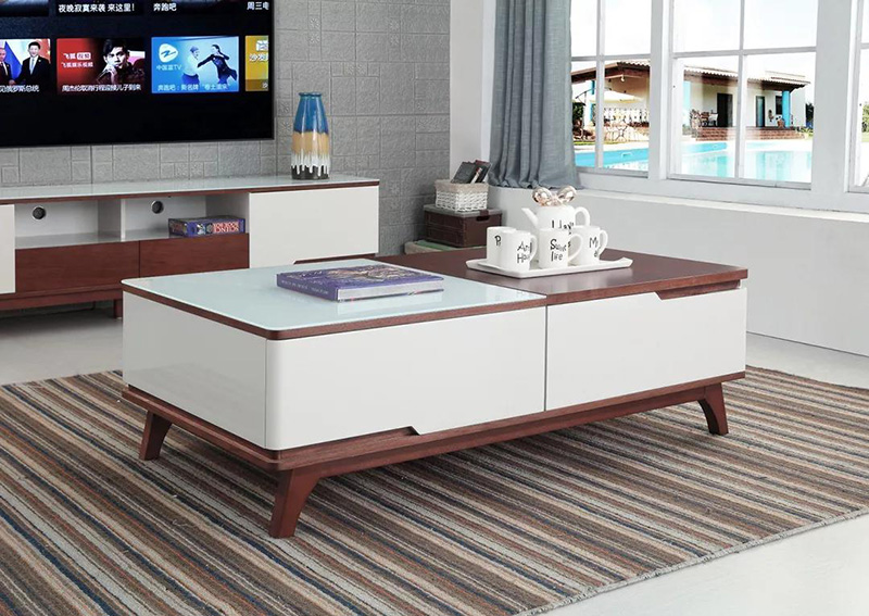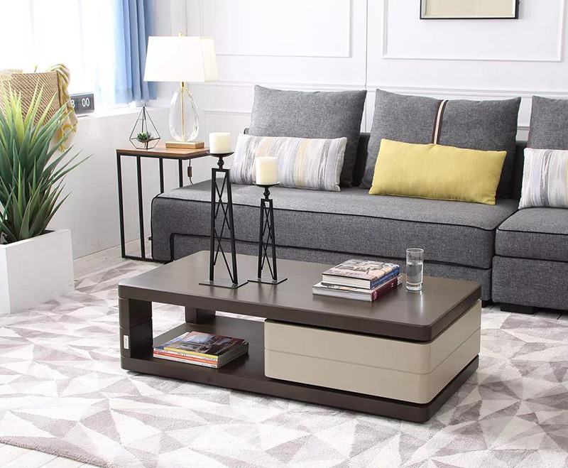 像這類有多個儲物格以及抽屜的茶幾,具備強大的收納功能,日常生活中的零碎物品,比如水杯、電視遙控器、空調遙控器、紙巾、書籍、小裝飾品,零食、小朋友的玩具….通通都能放。