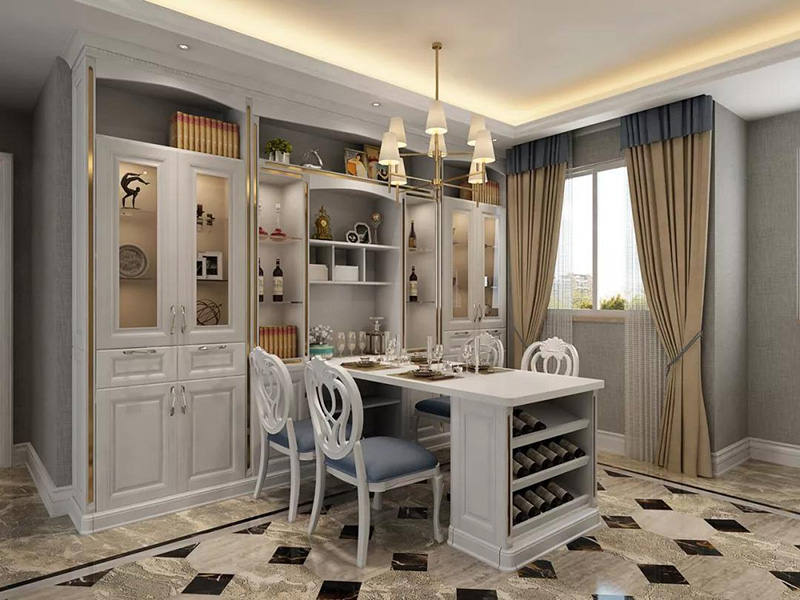 餐廳采用餐桌椅+餐酒櫃的組合,非常實用。餐桌的選擇比較簡單,用戶根據自己的喜好和戶型面積,選擇餐桌的形狀(方桌或是圓桌)、餐桌的大小,以及餐桌的材質。餐椅的選擇則更加豐富多樣,顏值上跟餐桌搭配,坐起來舒適即可。