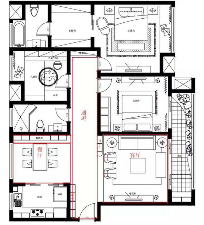 普通小戶型的用戶,通常會把客廳和餐廳合並在一個大空間,一個空間內實現兩個功能——用餐、娛樂,以提高空間的利用率。在具體設計時,可以根據用戶的喜好,進行一體式設計或者隔斷式設計。