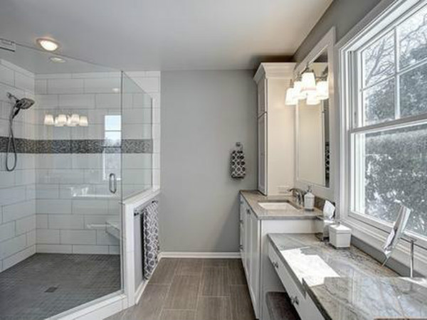 2、現代漂亮的淋浴房,灰色的主體色顯得簡單大氣,通過自然美感和現代設計的和諧關系彰顯特色。以這種木質材料為底座在排水上提高了便利,同時增強的摩擦力,使其在實用過程中不易絆倒,加大安全系數。也容易清理,承重能力也相對較好。