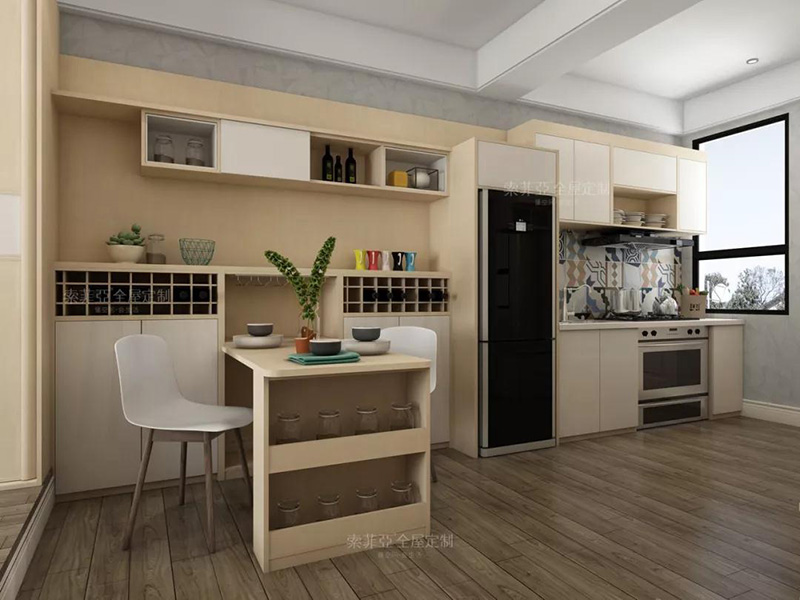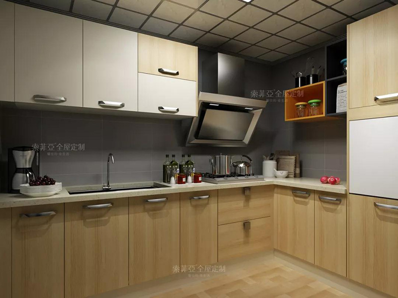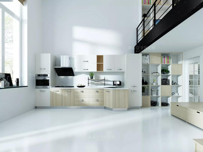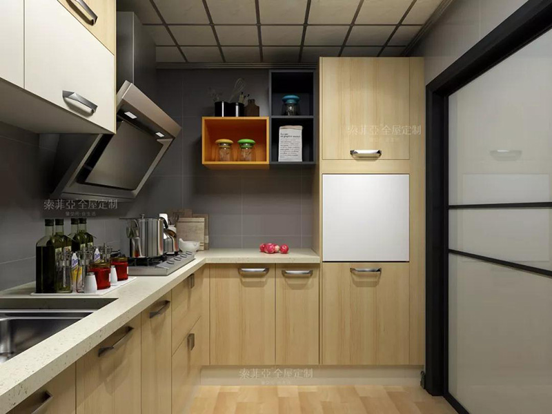 ►活用吊櫃。對廚房來說,吊櫃是廚房用具、小家電等物品最好的去處。在吊櫃里設置可下拉拉籃,不僅增加了許多收納空間,日常拿取也更方便。