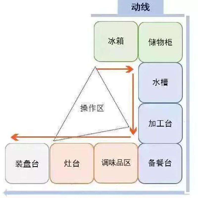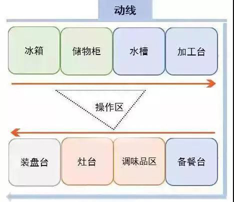 水槽和灶臺分別安置在對立的操作臺上,避免明水和明火的直接接觸。