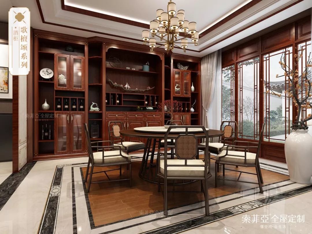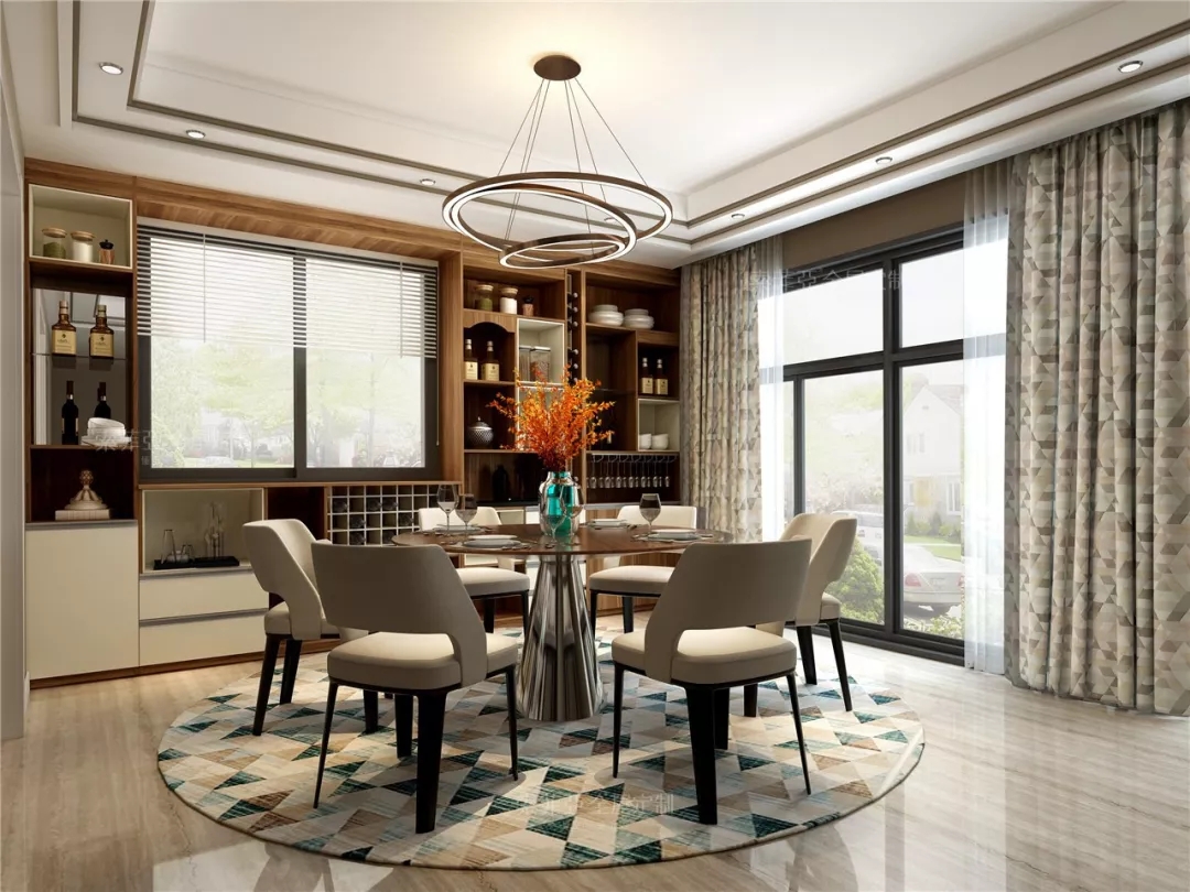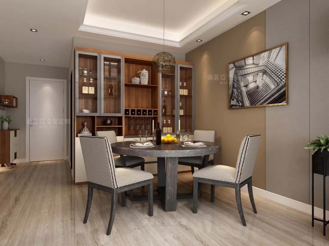 餐酒櫃不靠墻的情況下,還能做成隔斷櫃,中空的設計形成“隔而不斷”的通透效果。