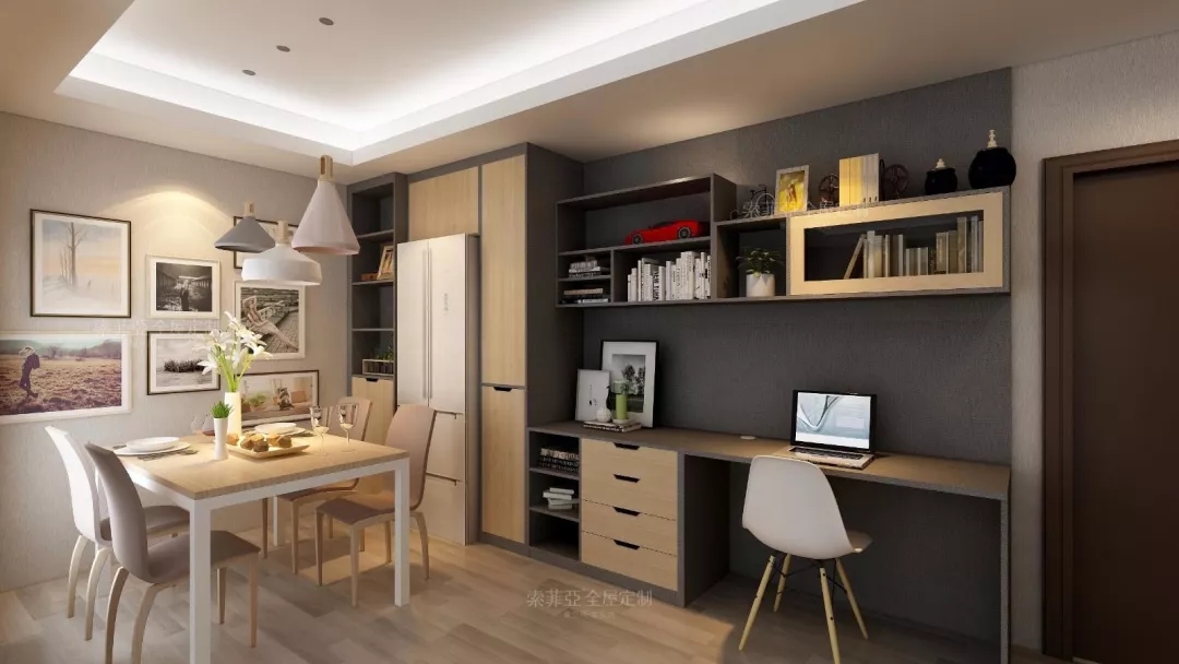 定設計方案之前,不妨和設計師一起商討把冰箱尺寸訂下來,讓冰箱置入到餐邊櫃里面。如果家里騰不開地方做書房,把書桌安在這里還能隨時和家里人親密交流。(裝潢的時候要記安裝通電插座)