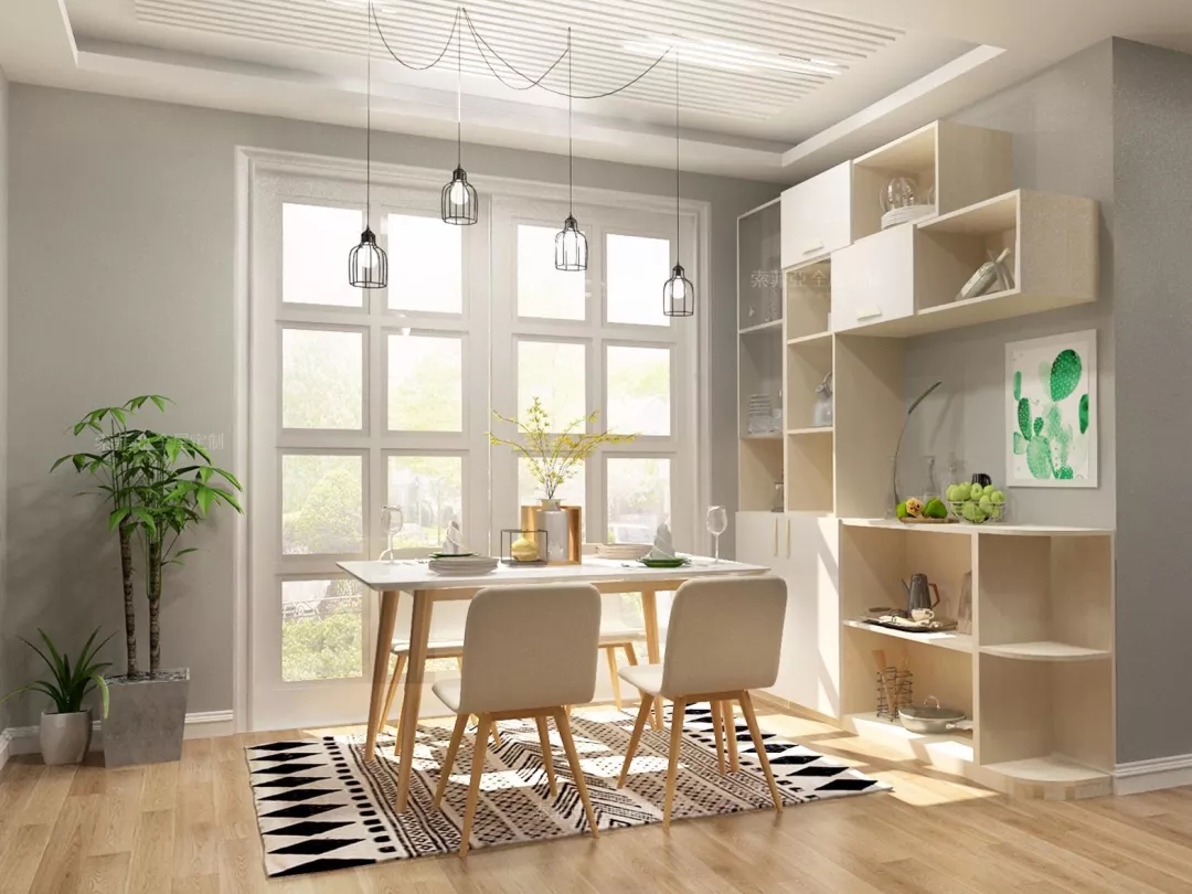 大空間可以隨心所欲。小戶型餐廳,建議使用方桌。圓桌需要大面積空間才放得下,方桌相對靈活,桌面利用率也比較高;方桌之所以省空間還因為它可以靠墻放,而圓桌就不太行~
