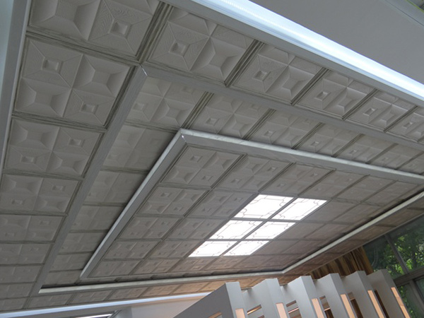 最普通最便宜,為家庭首選吊頂材料。它以PVC為原料,重量輕,能防水、防潮、防蛀。由于制作工藝中加入了阻燃材料,使用安全。PVC板的花色和圖案種類很多,多以素色為主,也有仿花紋、仿大理石紋的。它的截面為蜂巢狀網眼結構,兩邊有加工成型的企口和凹榫。挑選這類材料需注意表面應無裂紋和劃痕。企口和凹榫應完整平直,互相咬合順暢,局部沒有起伏和高度差現象。該板材可彎曲,有彈性,用手敲擊表面聲音清脆,遇有一定壓力時沒有下陷、變形的現象。它的缺點是耐高溫性能不佳,長期處于較熱的環境中容易變形。