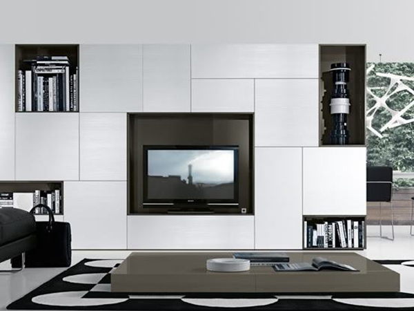 如果我們的客廳面積較小或者是客廳雜物較多的話,我們可以將電視背景墻上打造一個收納大櫃子。電視放置在收納櫃的正中央,而其周圍都是收納的櫃子,這樣一來便能夠為我們的客廳節省很多空間和位置,起到整潔、干凈的效果。