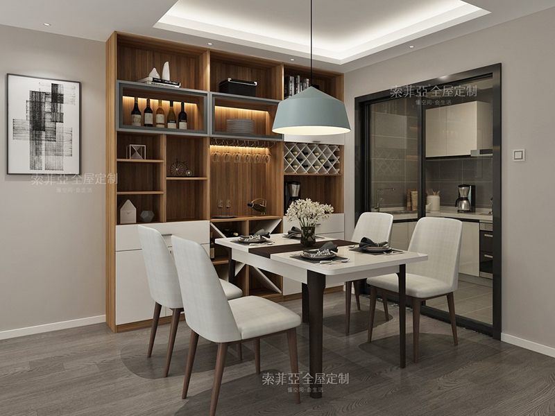 餐廳墻面裝飾:使用與家具搭配度高的顏色,齊腰位置考慮用些耐磨的材料,如選擇一些木飾、玻璃、鏡子做局部護墻處理,而且能營造出一種清新、優雅的氛圍,以增加就餐者的食欲,給人以寬敞感。