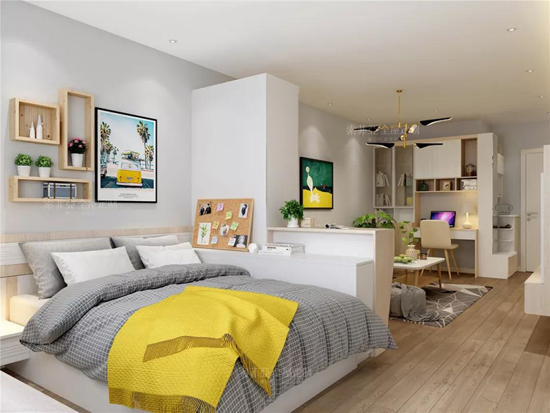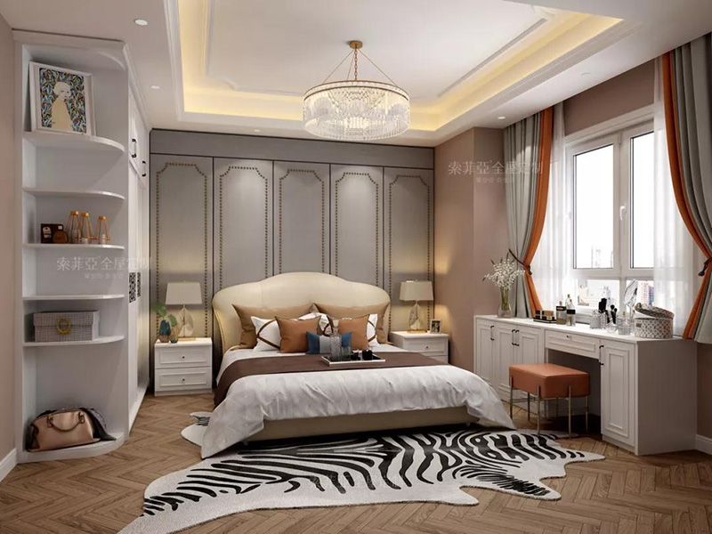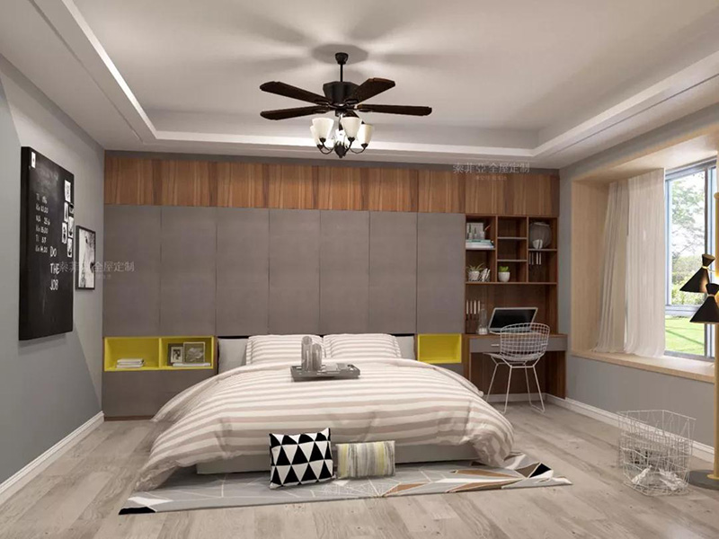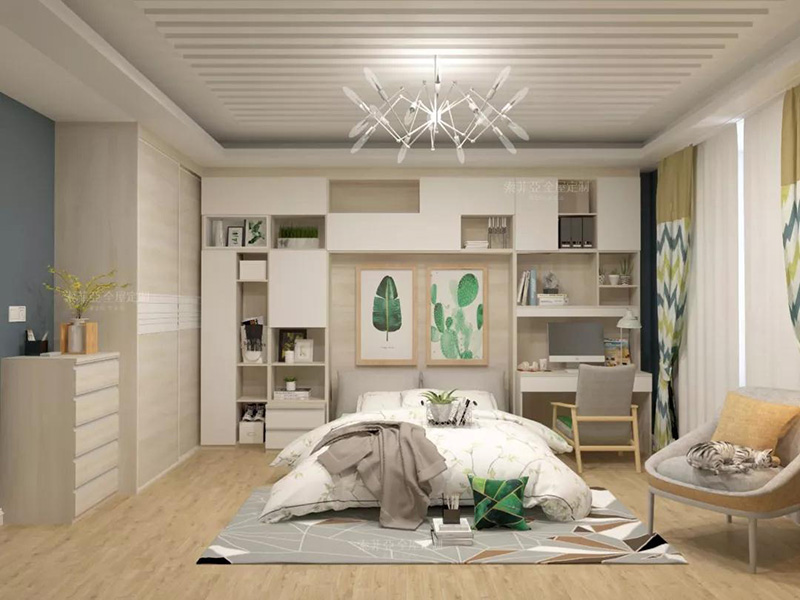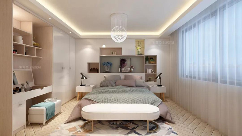 客製化收納背景墻連接床頭工作區或者梳妝臺,讓臥室的各功能區和諧統一。