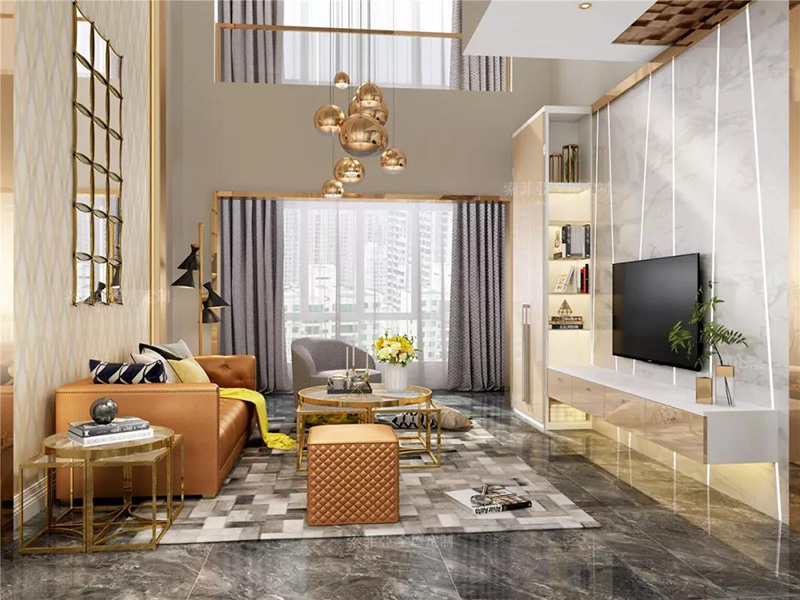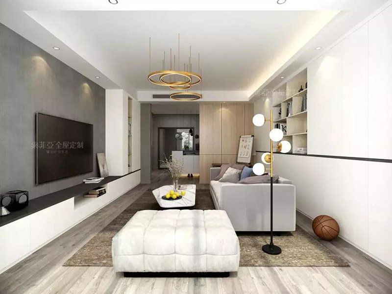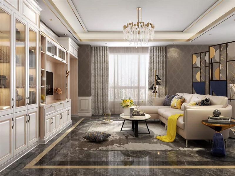 而利用整墻式電視櫃打造的回字型布局,大氣奢華,無論是展示能力還收納能力都可以兼顧。