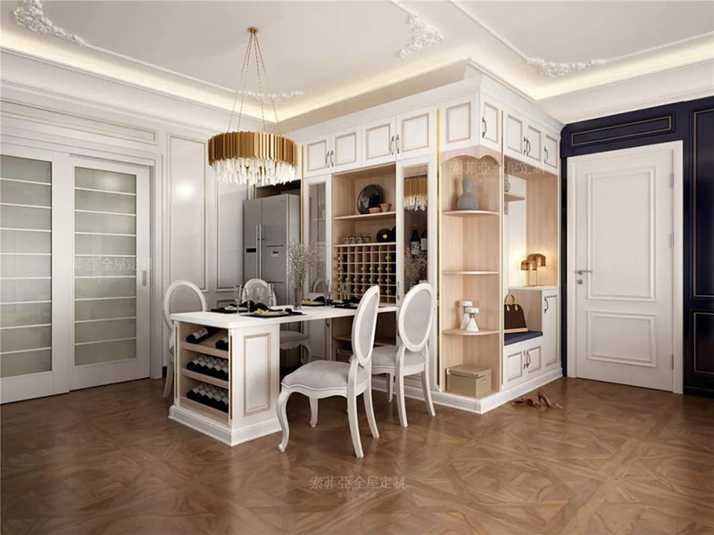 假如入戶玄關是有凸墻的戶型,還可以做入戶櫃+餐酒櫃的布局,空間整體性和動線流暢性都能兼顧,一舉兩得。