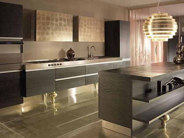 光潔明亮,各項性能較為優秀。它一般是在密度防火板表面再加一層薄不銹鋼板,但視覺較“硬”,在櫥櫃臺面的各轉角部位和各結合部缺乏合理的、有效的處理手段,不太適用民用廚房。