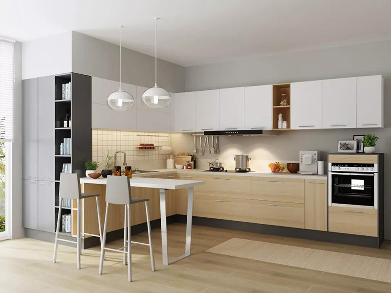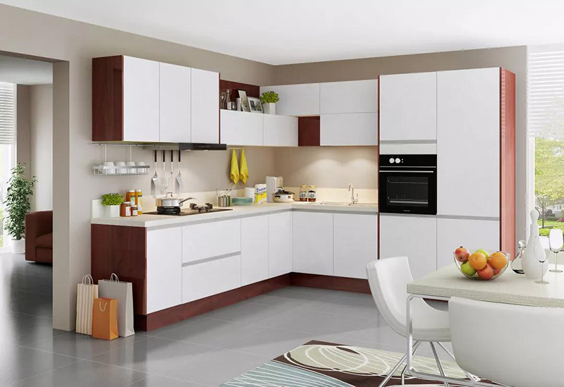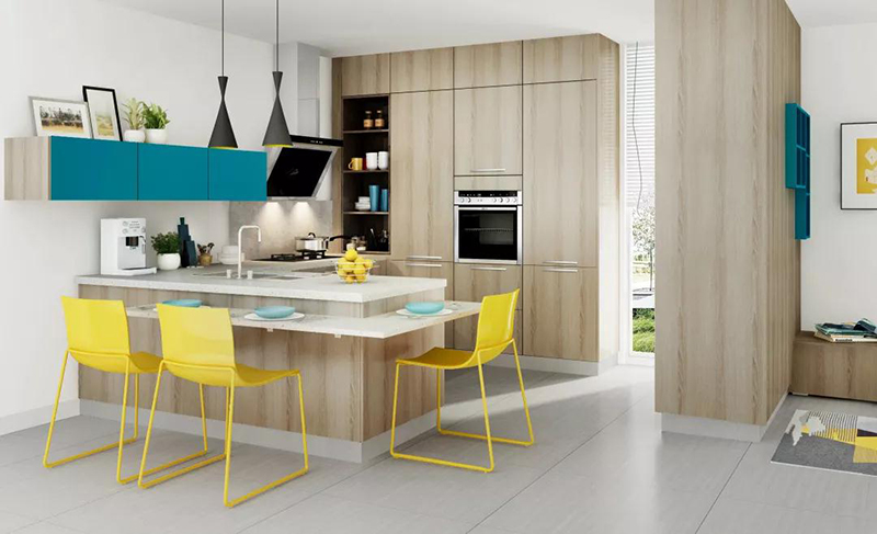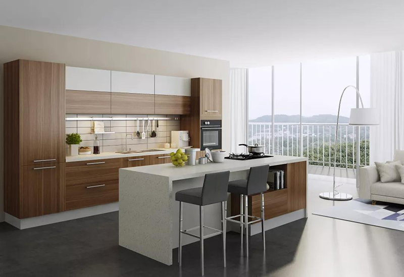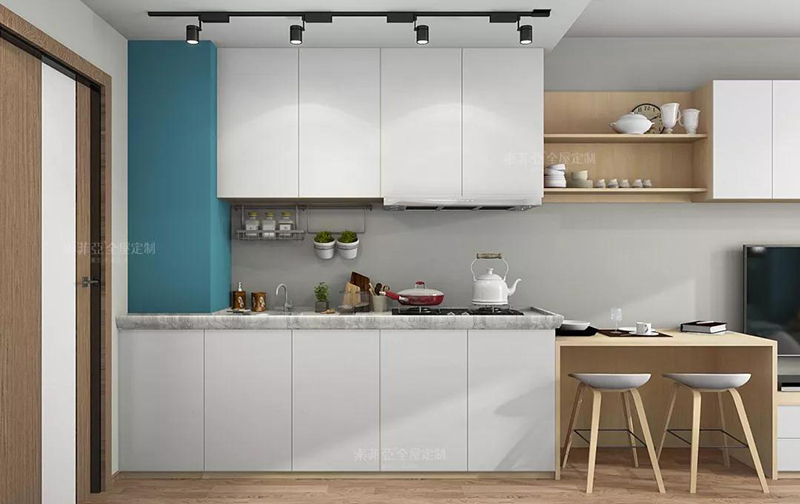 戶型小的房子或者是公寓式住宅,適合一字型的開放式廚房,靠墻和餐桌做一體設計,能最大化利用空間。