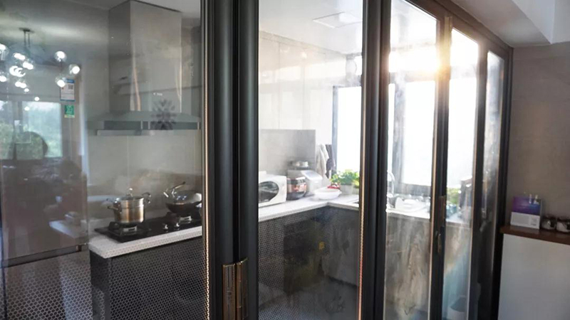 安裝玻璃折疊門是一個兩全其美的好辦法。平時把玻璃門打開,完全是一個開放式廚房的效果,炒菜時把門關上,也沒有影響到採光,一舉兩得。