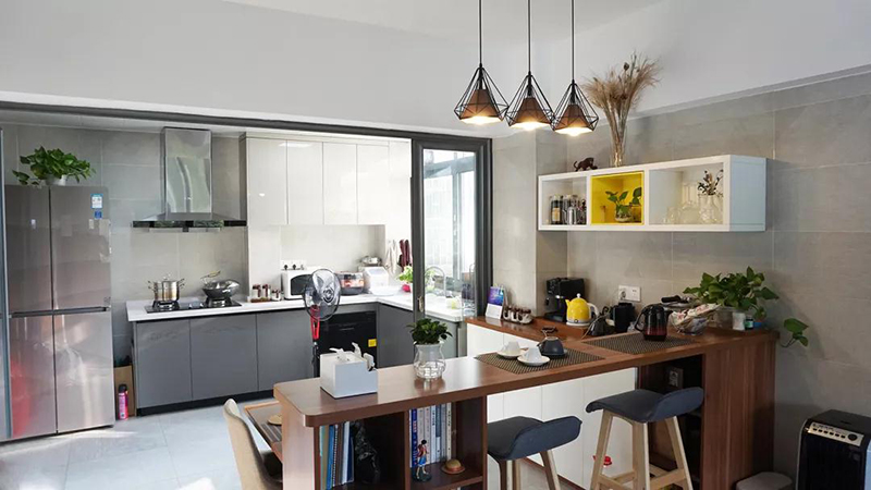 開放式廚房能讓廚房里的人視野觸及到客廳,也能讓客廳里的人更清楚地看到廚房忙碌的身影,就算沒法幫上忙也能讓吃飯的人深感一頓飯煮出來有多不容易。