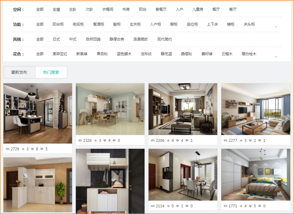 消費者圖庫一個大的看圖平臺,共有1000多套效果圖供您查看,用戶可以根據個人喜好按空間、功能、風格、花色來篩選自己要查閱的圖片,也可以登錄編寫評論、收藏方案及填寫資料發布報價獲取需求。