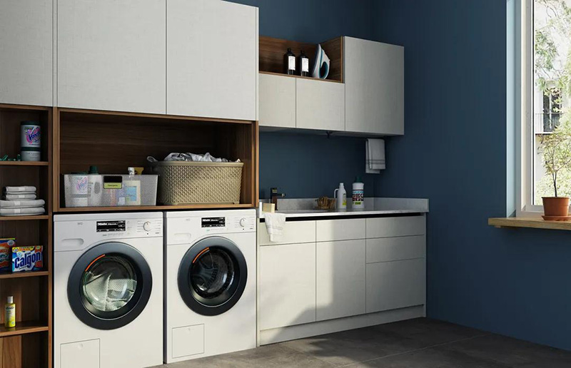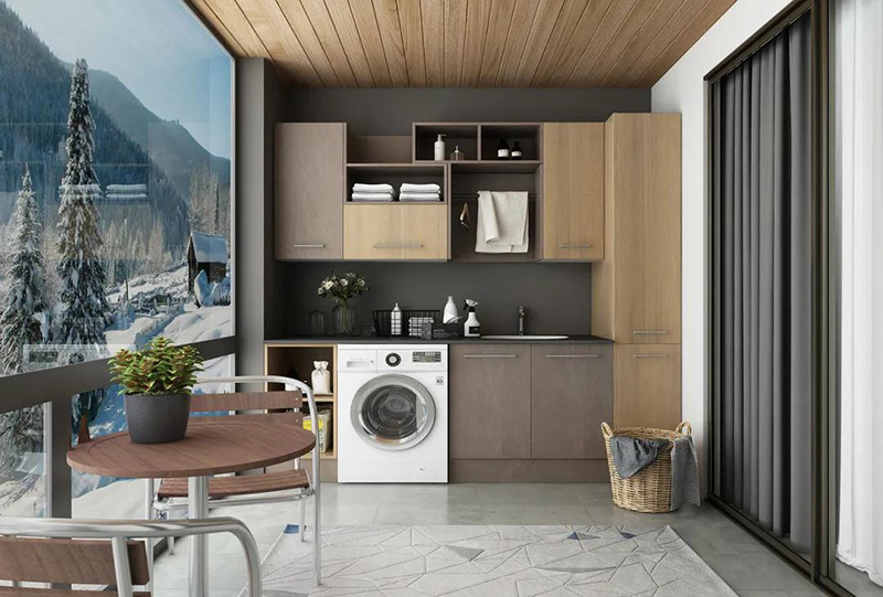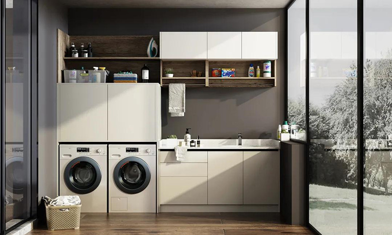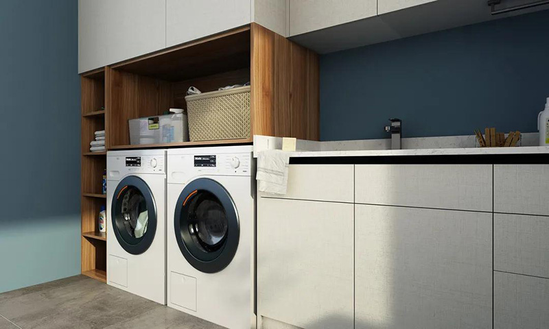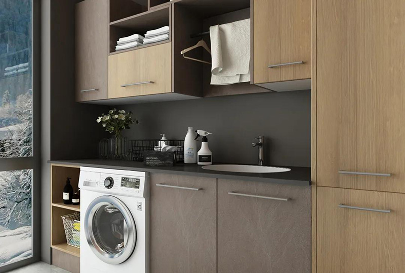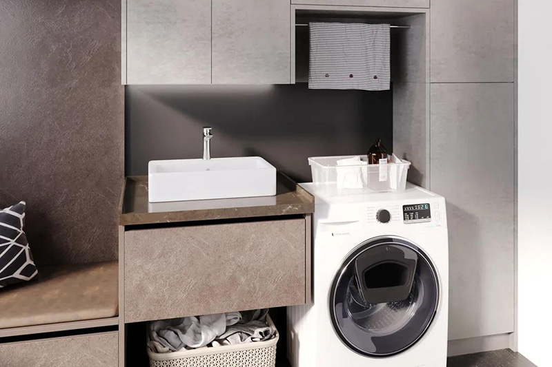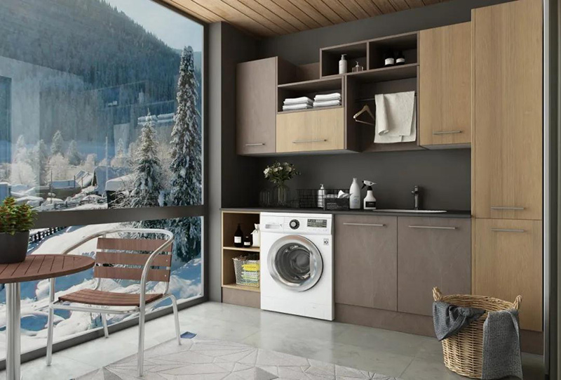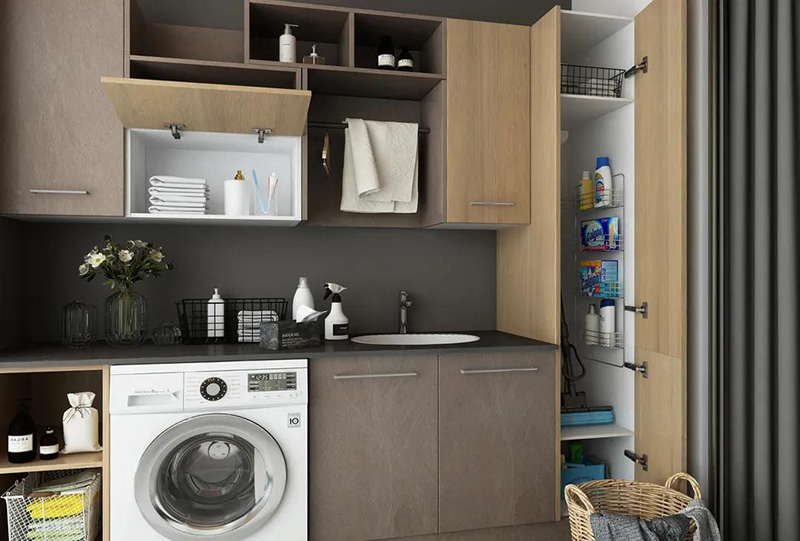 千萬要注意的是,將洗衣機放置在陽臺,一定要提前規劃好水管電路,預留好插座。洗衣機邊上的櫃子一定要做好防水。