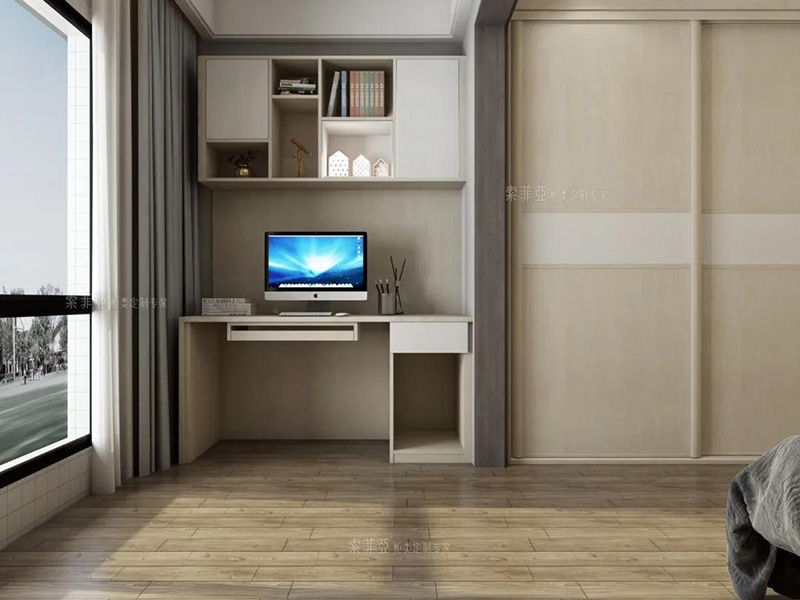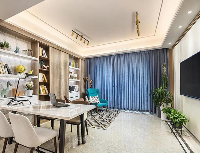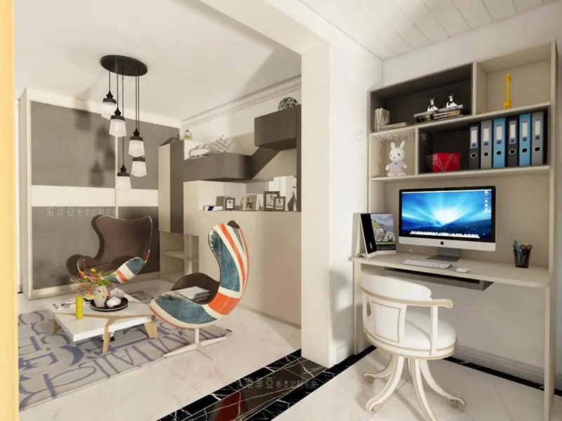 甚至家里沒有多余的房間打造書房的話,在陽臺可以用書桌書櫃打造一個簡易的工作區,利用門洞形成的半圍合布局還能有效提升工作的專注度。