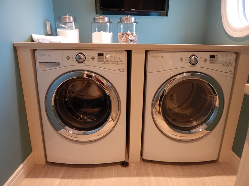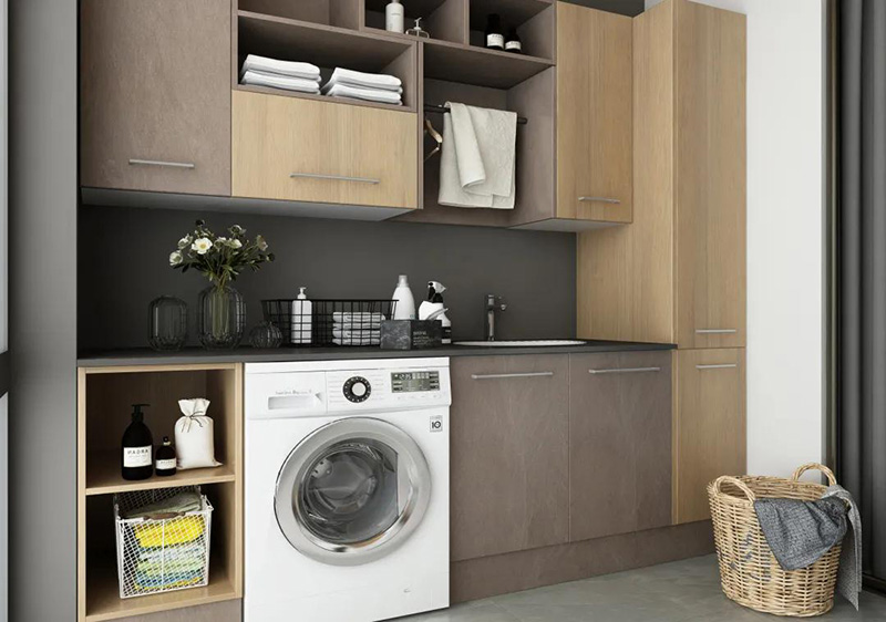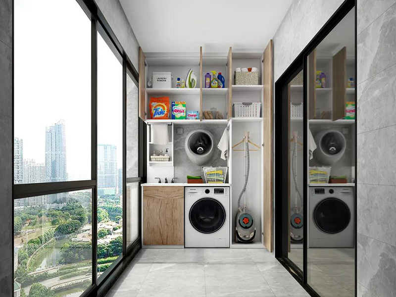 假如想要給陽臺櫃留出更多收納空間,那么還可以選擇自帶烘干功能的洗衣機,一樣很方便。