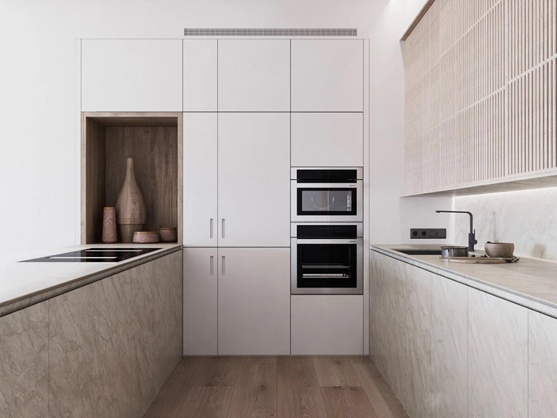 1、全鋁家居客製化施工中要注重櫥櫃臺面是否平整、有無裂痕,驗收要注意臺面,應確保沒有裂紋,收口圓滑,水盆和灶臺開后尺寸合理,水龍頭安裝牢固,下水管無漏水。在臺面交接處不能看到很明顯的膠結的痕跡,打膠必須很平滑。當人造理石拼接完后,站在兩米處直觀看不到接縫痕跡,方算合格。