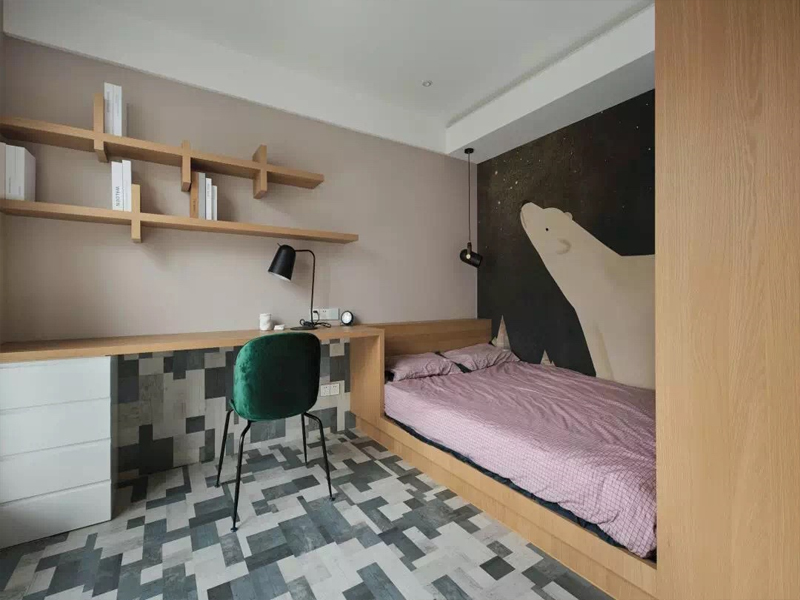 以床為中心,床頭需靠墻擺放,床的另一頭左右兩側分別放置餐桌與寫字臺,這樣就形成兩邊櫥與櫥對稱、臺子與臺子的對稱,看起來更加的寬敞、整齊。