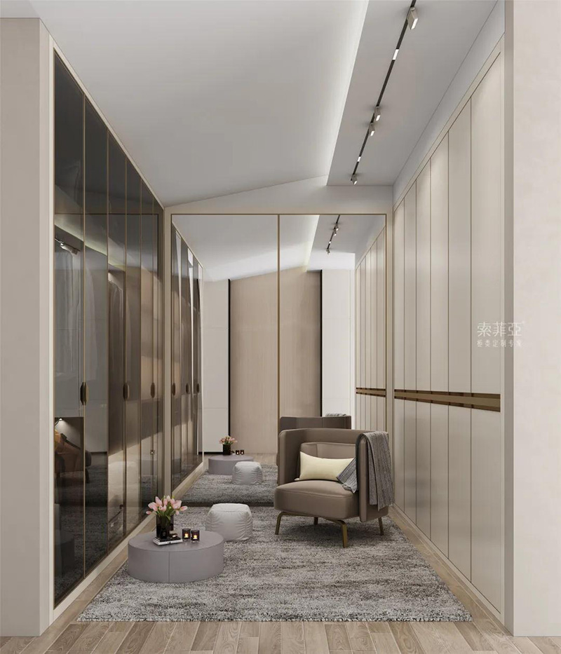 如果是封閉的狹長空間,兩面墻做櫃子,中間做落地全身鏡,提升空間的縱深感,特顯高級~