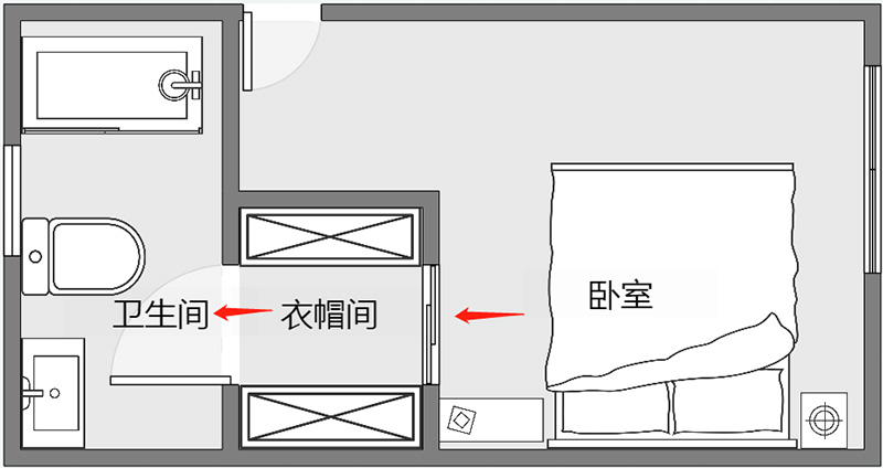 需注意的是:這種改造方式更適合衛生間帶通風窗的戶型,以免衛生間的潮氣滲入衣帽間。