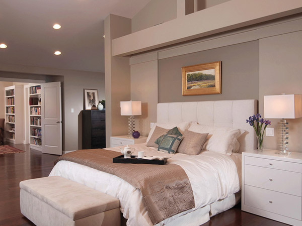 在別墅臥室裝潢設計時,要注重視覺舒適,視覺舒適指臥室設計時色調要柔和、單純,采用暖灰色調,多采用類似顏色,少用對比色。造型可多些曲線,避免棱角,室內織物要柔軟、觸感好,溫馨浪漫。