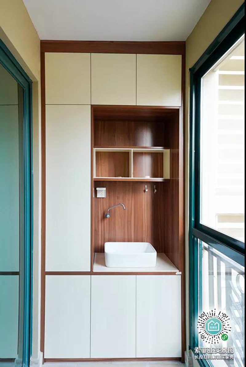 家務區是最常見的陽臺用法,預先布好排水和插座后,打造一個含有洗漱盆的陽臺櫃,不但可以方便洗漱、澆花、拖地擦窗等家務活,還可以放下洗衣機烘干機。