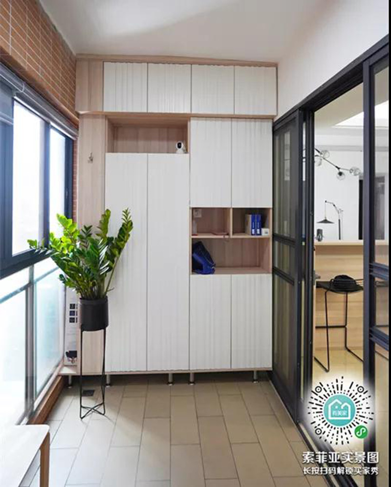 每個戶型的結構都不一樣,有些是進門即陽臺的戶型,這種穿過陽臺進屋里的情況,適合靠墻打造一個入戶櫃,實用又省地。