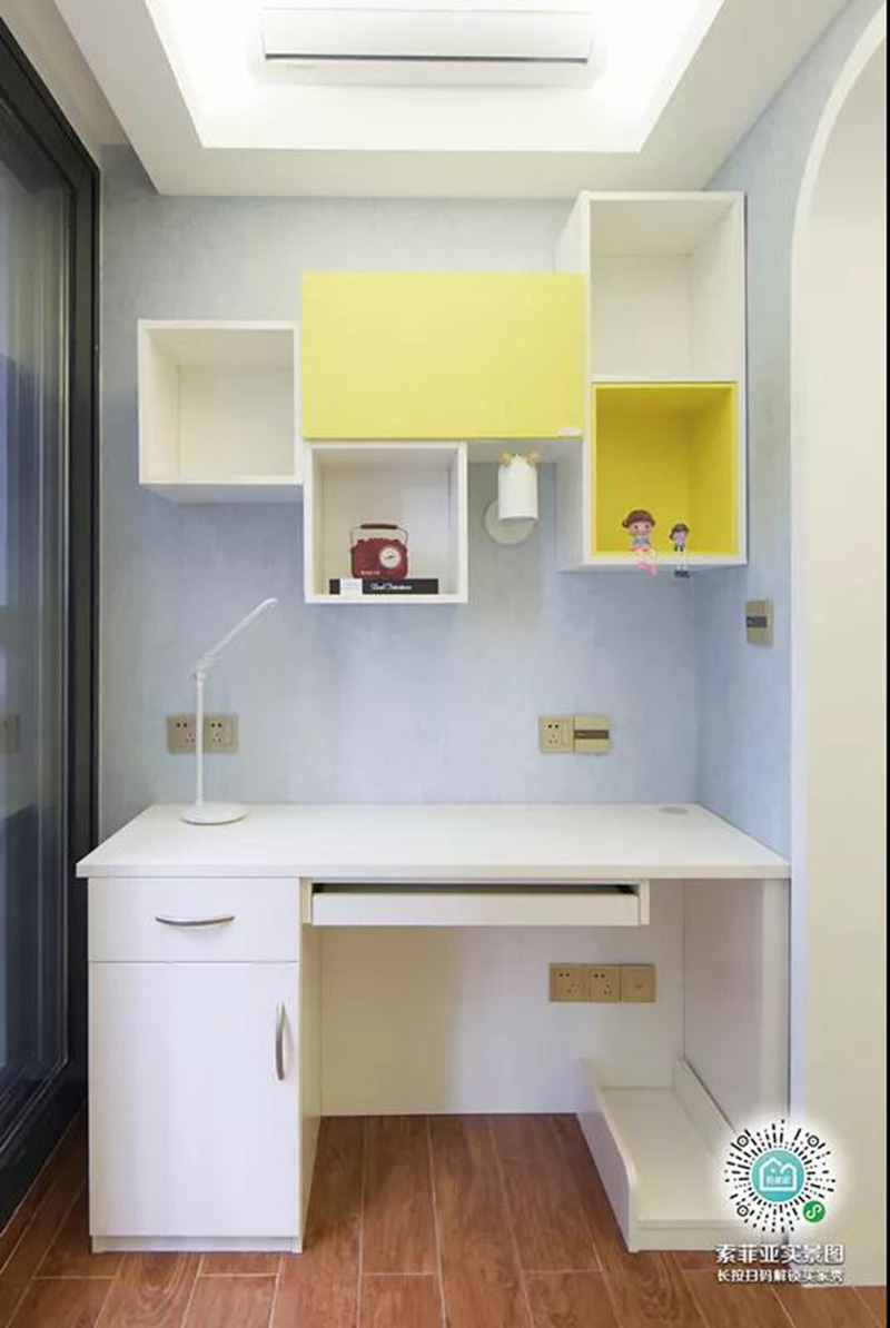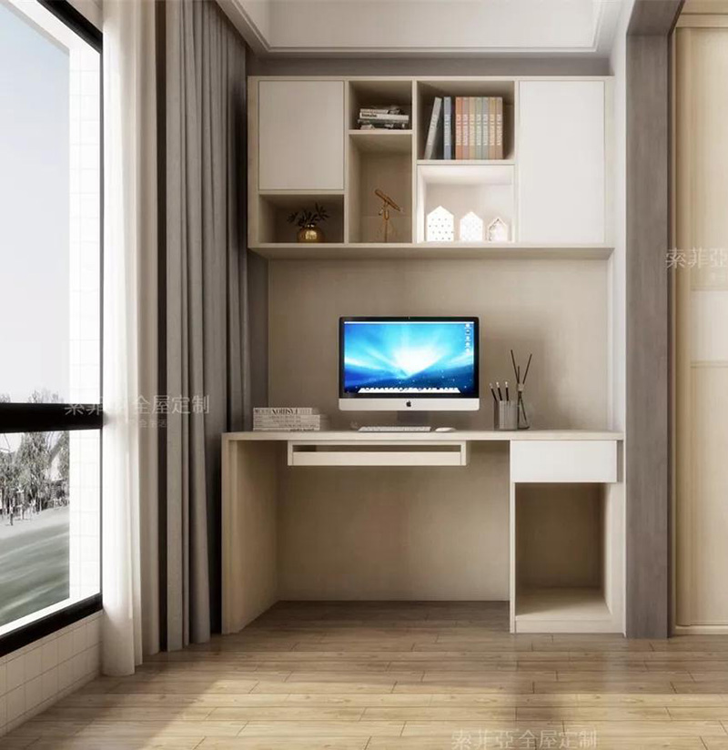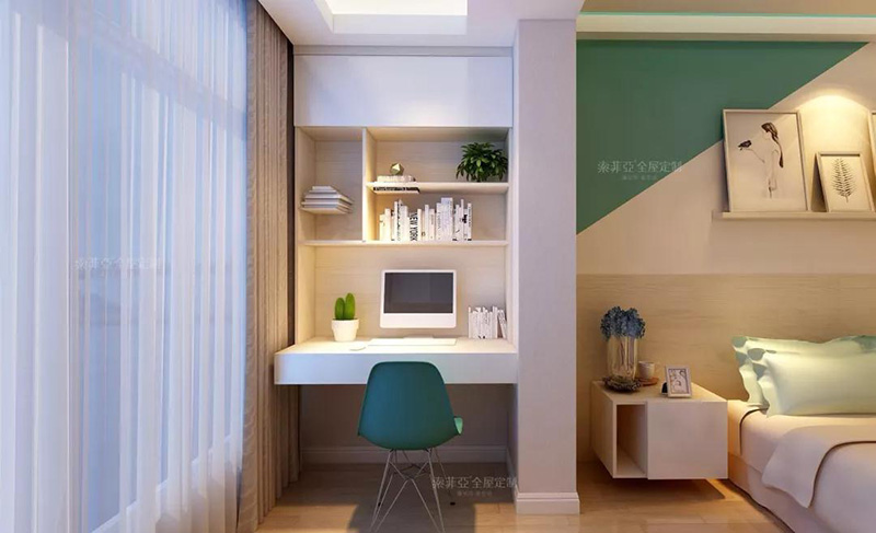 沒有獨立書房,不妨打陽臺的主意(客廳臥室都可以),將陽臺封好后,把書桌、書櫃搬到陽臺,記住陽臺一定要裝上遮光窗簾,避免陽光過于刺眼哦。