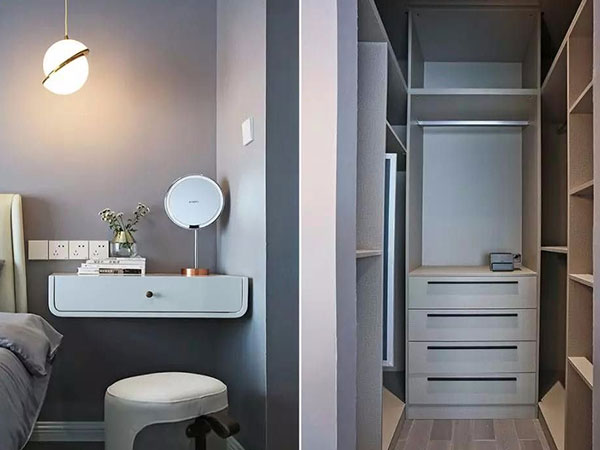 在改造衣帽間時,我們可以根據衣帽間的用途、個人的使用習慣等在進行設計制作。衣櫃和吊頂之間最好保持30mm左右的間隙。一般情況下主臥的衛生間沒有窗戶,因此改造衣帽間時,我們可以在天花板上安裝排氣扇,確保室內空氣流通。