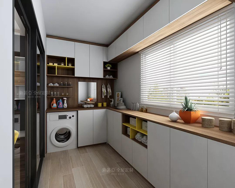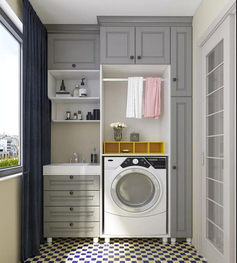 如果你家有洗衣房,那么恭喜你,可以將洗衣房好好打造一番,陽臺櫃+儲物櫃,打造一個U型儲物空間,洗衣儲物有條不紊。