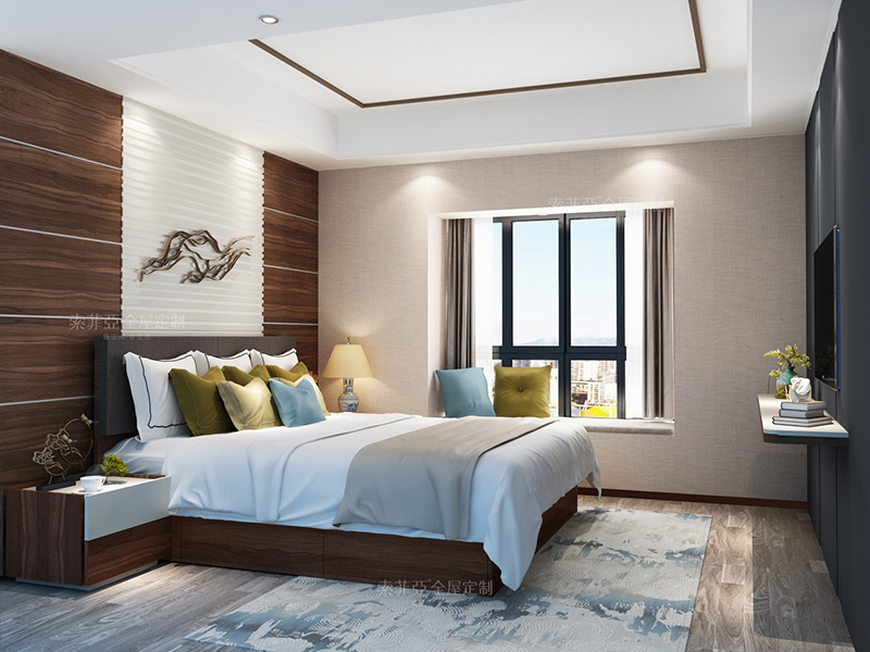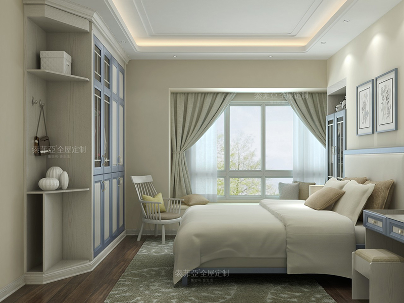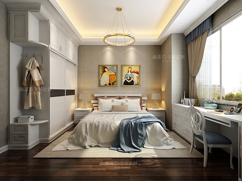 習慣在臥室工作、學習的朋友們,把飄窗改造成書桌,最大限度地接觸到自然光,適合看書、寫字,愛美的朋友們還可以當成梳妝臺。在墻角客製化一個床頭櫃,又能放置不少物品。床靠飄窗,累了還可以立刻躺在床上休息。