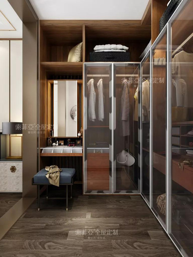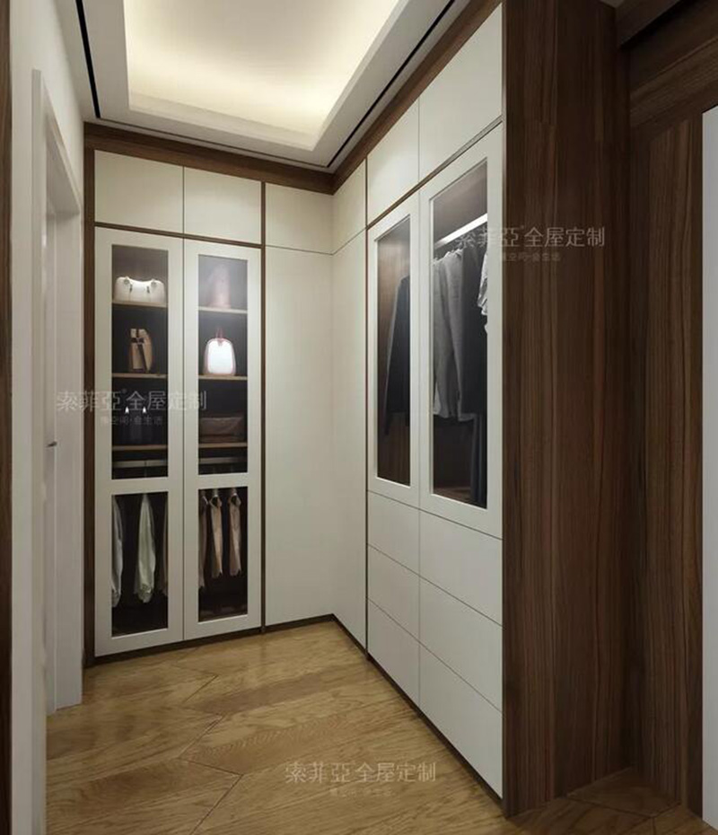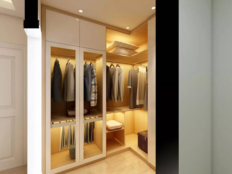 如果你的衣帽間是沒有窗的,建議在櫃內設計防眩光的燈帶,既美觀又能方便查找衣物;另外,在梳妝臺、穿衣鏡邊安裝壁燈,減少陰影。