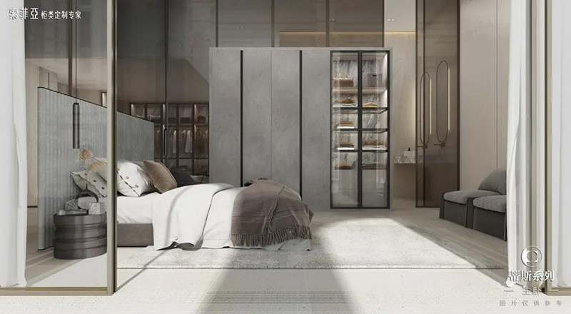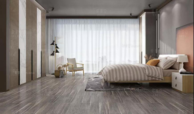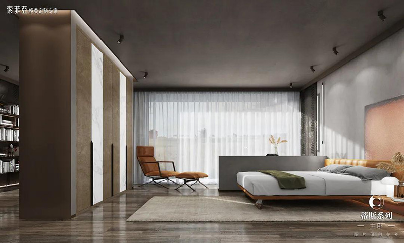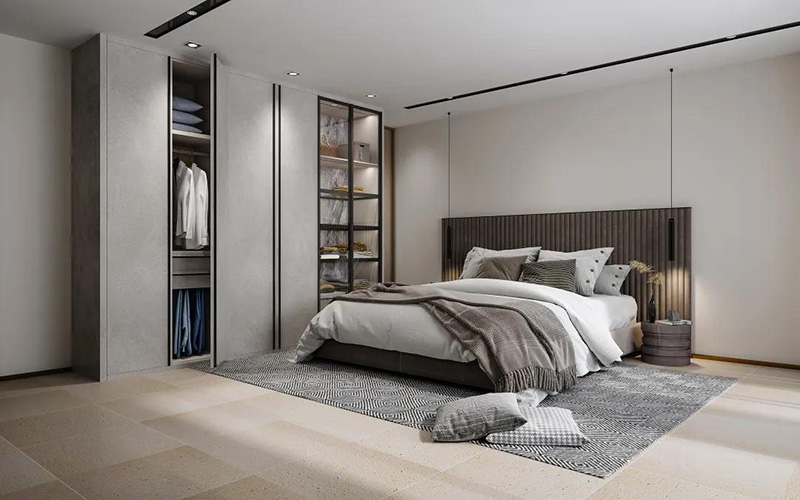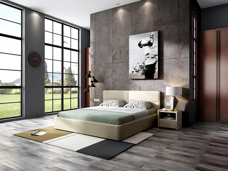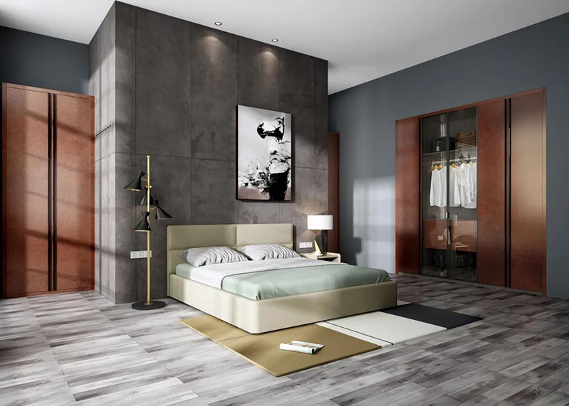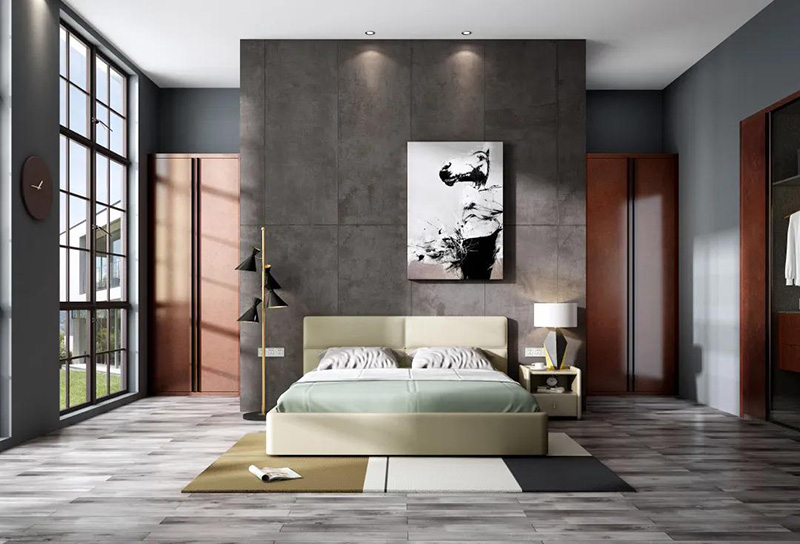 蒂斯系列用印象水泥和火山巖搭配米灰皮紋,還原出真實石材的視覺效果,打破了臥室空間傳統材質的桎梏。