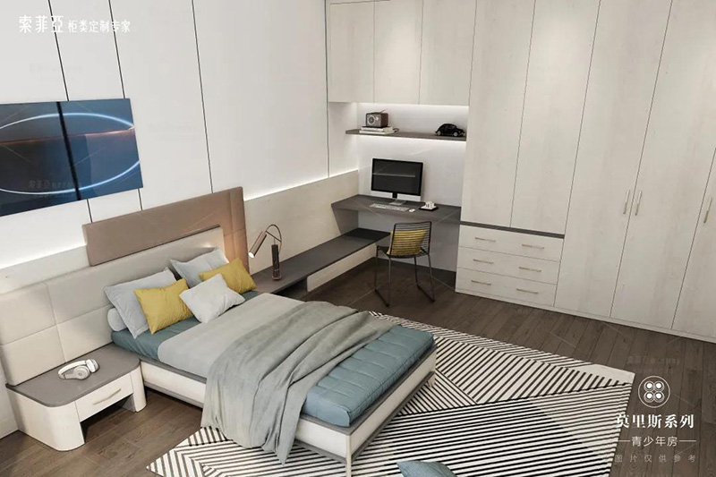 ▼設計亮點:青少年房通過整墻衣櫃和書桌擱板一體式設計,墻面空間利用率更高。