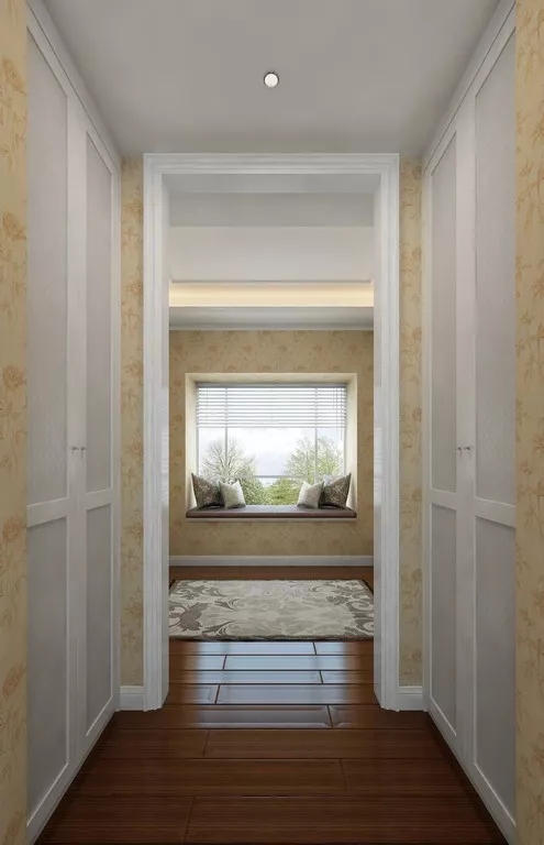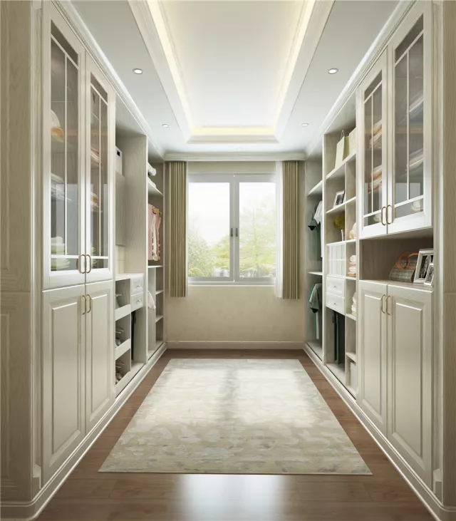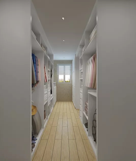 雙一字型衣帽間其實就是兩個一字型衣櫃組合而成;或者一邊是一字型衣櫃,一邊是梳妝臺都有可能;適合較狹長的過道、走廊、入戶等空間。