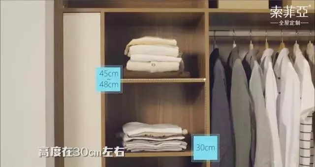 衣帽間內部各個功能區的尺寸其實更個性化,在側板兩邊鉆排孔,層板的調整會更靈活自由。這里我僅提供一些參考:一般疊放區的寬度控制在45~48cm,高度則控制在30cm左右較合適。