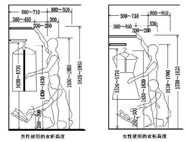 根據亞洲人的衣服肩寬,衣帽間進深設計在600mm~650mm較為合理,太淺的話,平時開門容易擦到衣肩,關門容易夾到衣袖;太深則會浪費空間。