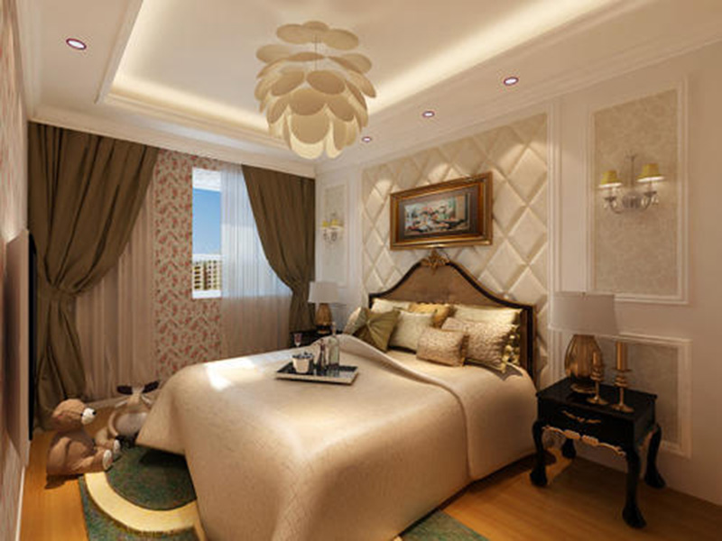 臥室的照明燈飾一般不能用太過于強烈的光源,可以選擇一盞吸頂燈或小型吊燈作為主光源。燈具的擺放也盡量不要放在床頂直射,直射的光線不僅會影響健康還會影響情緒。