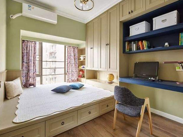 4、一些臥室用藍色作為主題色彩,第1眼就給人清新的感覺,榻榻米與衣櫃的完美結合,也成了另一大亮點,左邊的吊櫃也為臥室增加了更多的儲物功能,在客製化性方面都是體現的好的,這就是客製化家具的所在了。