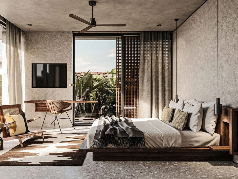 男性臥室多使用純色,很少有花哨的圖案,可以選一些肌理感很強的材料,比如磚紋、石材、木紋等,來豐富空間的層次,而且也能帶來強烈的視覺效果。