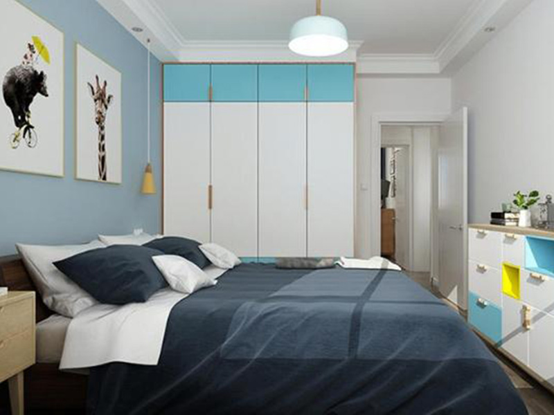 臥室墻壁上采用白色的格調,搭配淺藍色的格調,顯得非常清新自然,白色的門非常精致素雅,把臥室裝飾的更加美觀漂亮。