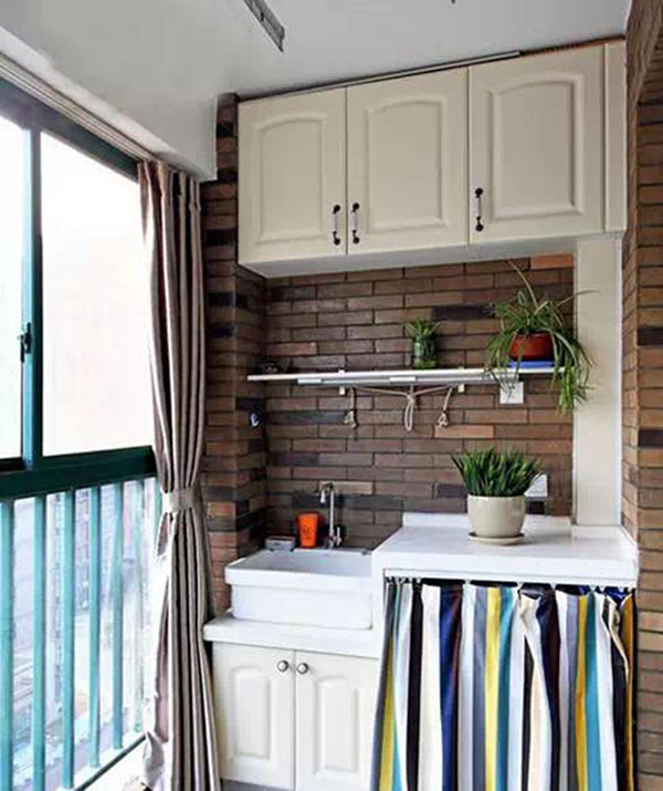 3.洗衣機放在陽臺很容易積灰?給它一個空間藏起來好了!旁邊小水池也方便日常清洗小衣物,墻面置物架上放幾盆綠植,陽臺功能性與觀賞性都有了!
