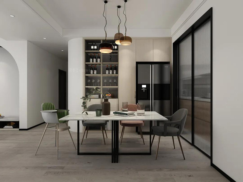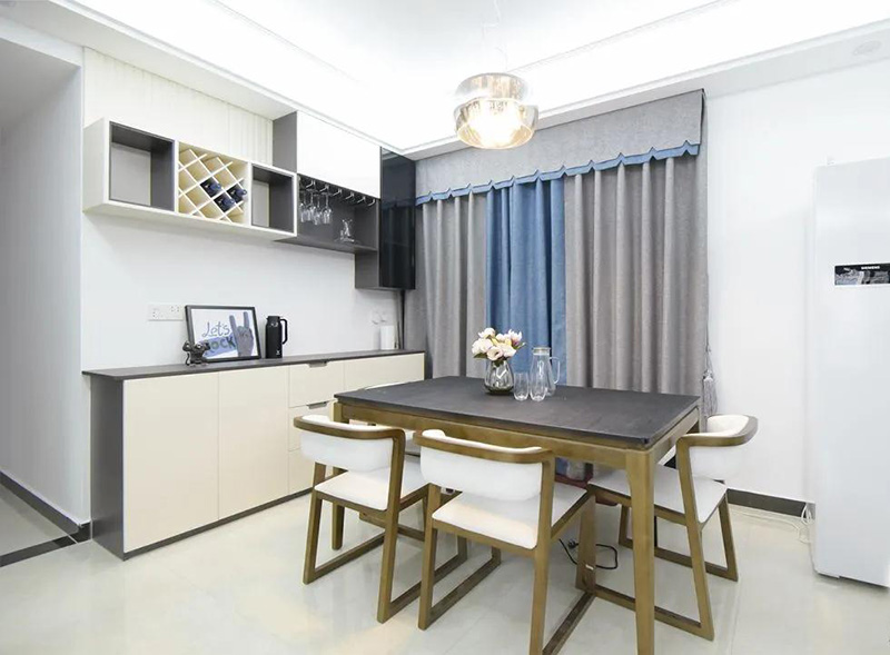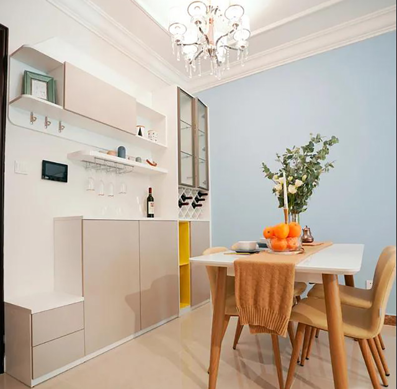 進門就是餐廳,將餐邊櫃與入戶櫃結合,解決小戶型收納難題。