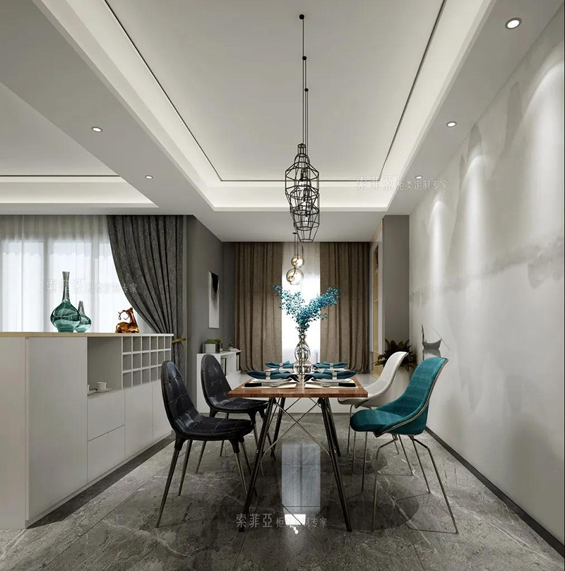 還可以高櫃+吊櫃+矮櫃花色組合,凹起造型來更時尚,裝點餐廳更好看。