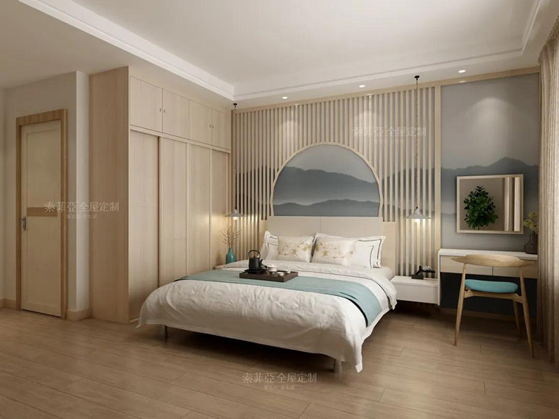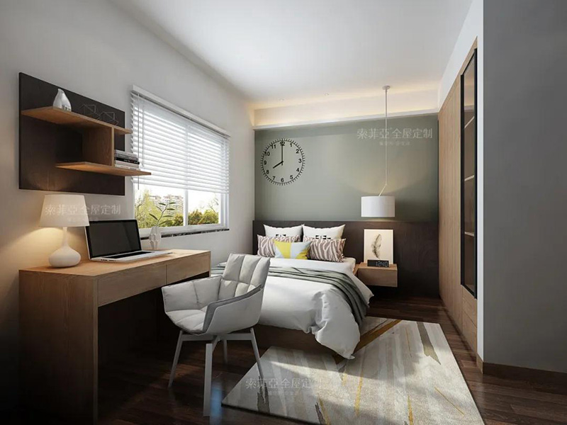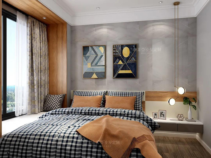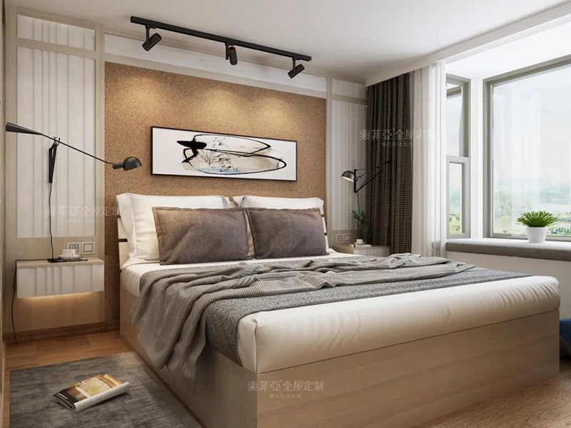 如果床的一側是擺放衣櫃的布局,則可以將衣櫃一側做開放設計,延伸出床頭收納區。