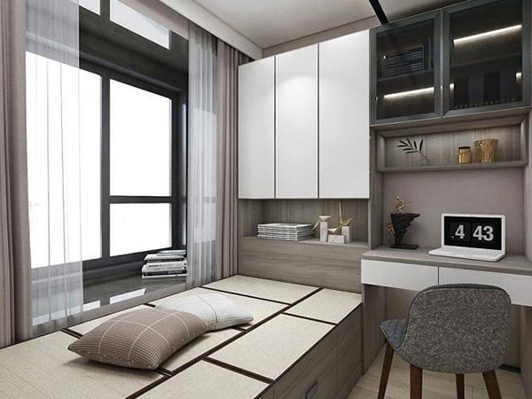 我們可以在榻榻米底部的位置設計一些儲物櫃,把平時不怎麼用到的東西儲存在榻榻米的櫃子里,充分使用空間里的收納功能。還可以將它設計成桌子床以及椅子沙發等家具,盡量減少家具的多余堆放。