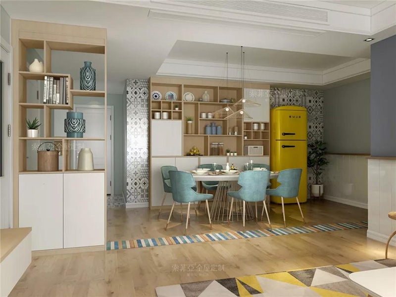 紙尿褲、寶寶的玩具放在電視櫃里邊,而寶寶的奶粉、米糊、面條、奶瓶等都存在餐邊櫃,和大人的干糧分開,找起來也比較方便。要是沒有餐邊櫃,我甚至沒法想象這些東西能放哪,有孩子的都懂。”